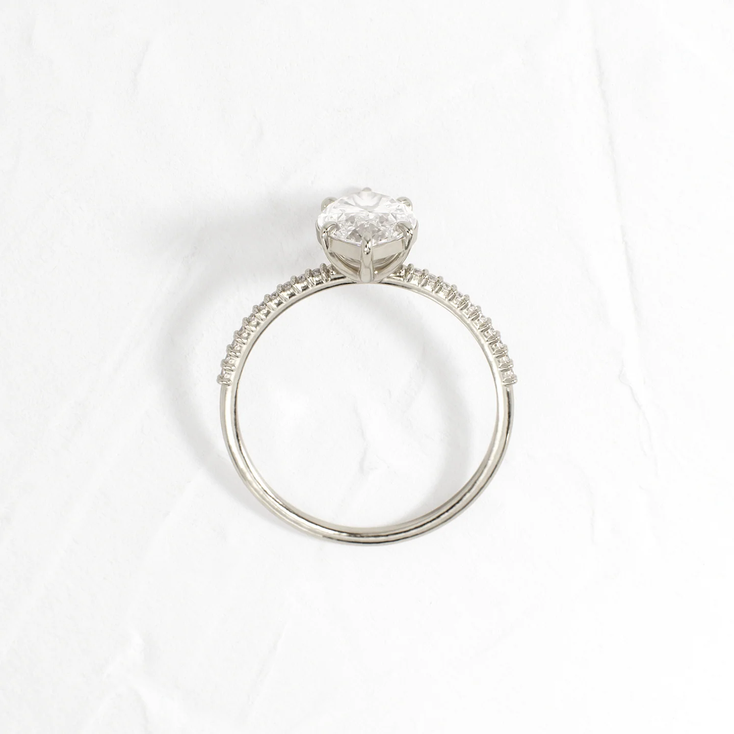 The delicate pave band adds subtle shimmer without overpowering the focal diamond. Its slender profile and inconspicuous structure ensure that simplicity becomes the true statement.